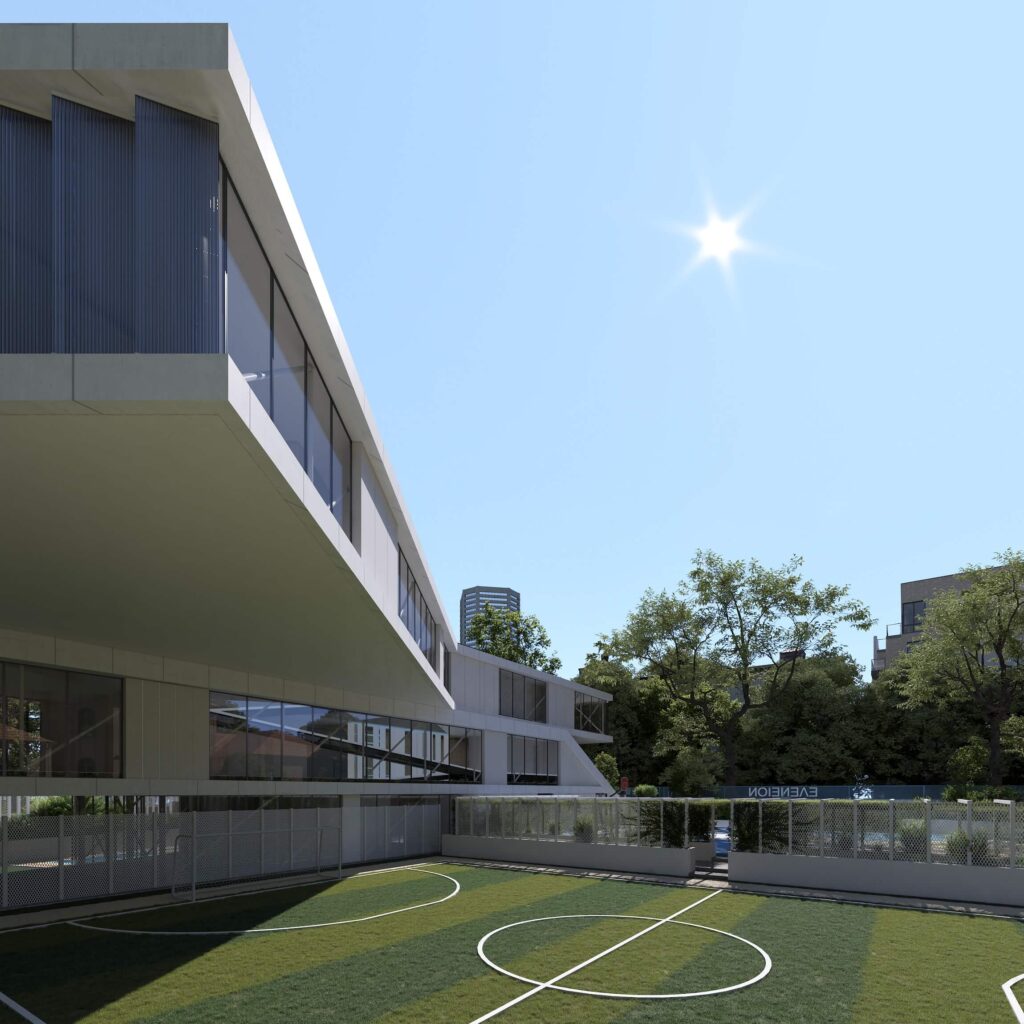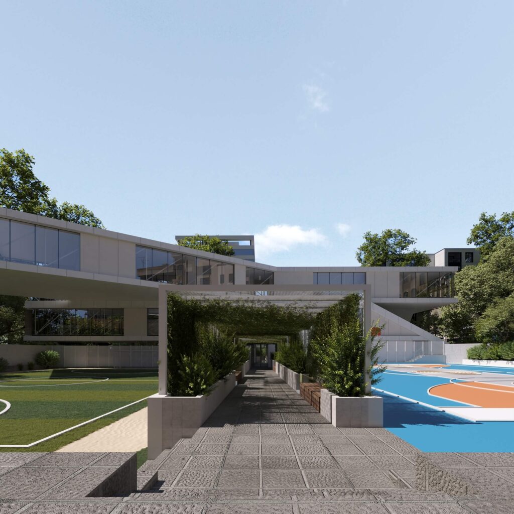 A green corridor, both a pathway and a playground, forms the heart of the site, connecting new and old in a verdant embrace. It is a space for pause, reflection, and connection, surrounded by athletic zones designed for multifaceted use and diverse school events.