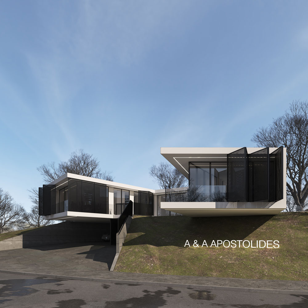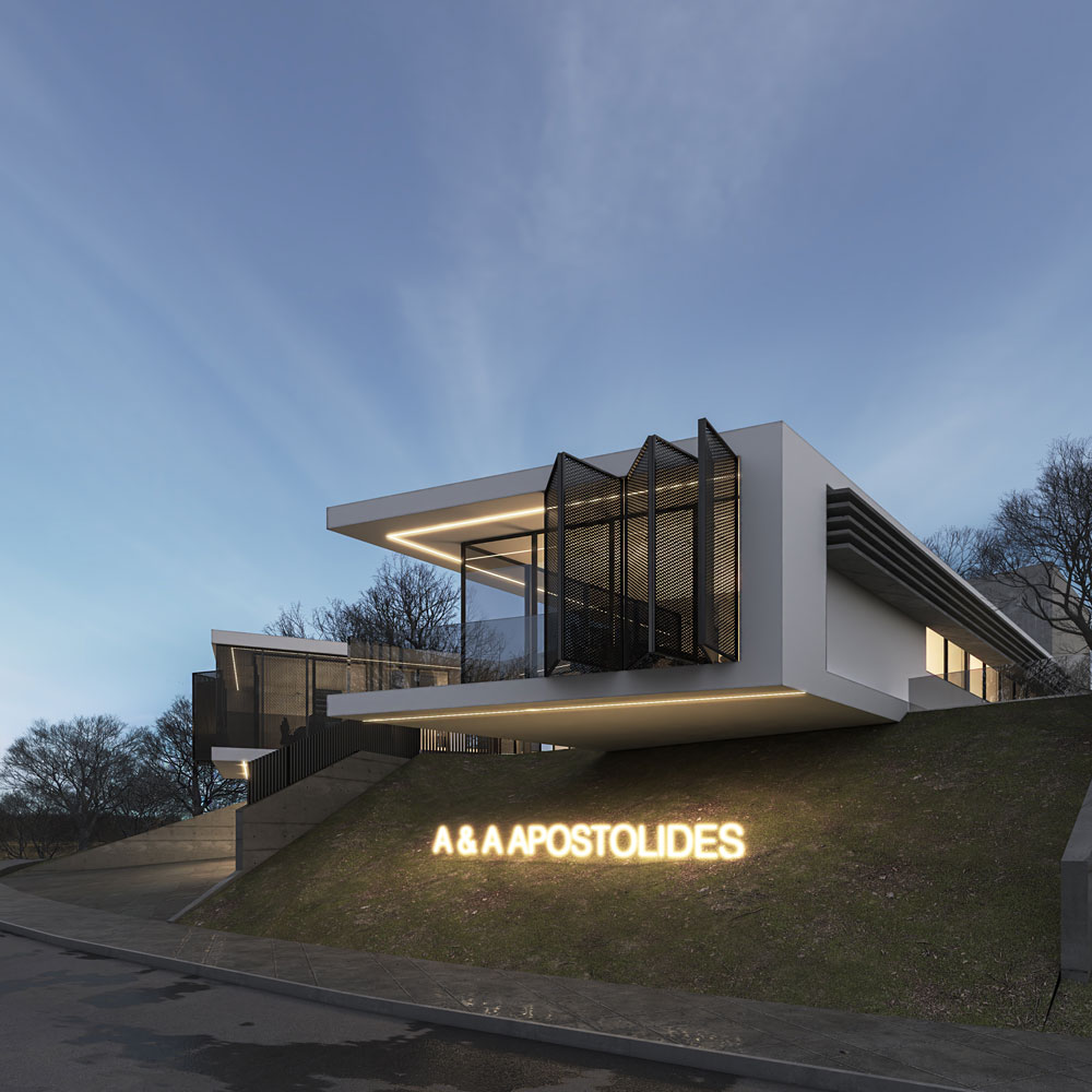 The office building of the company A&A Apostolides is adjacent to a residential area. The design approach was based on the absolute respect of the existing built environment while maintaining low heights and small volumes. The development of the building program in two wings allows the hierarchical location of the offices, taking advantage of the natural light and air in all areas. In the center with unobstructed views of the city of Nicosia is located the meeting room. The natural slope of the plot is maintained by creating a natural green pedestal for the building while hiding the underground parking lot.