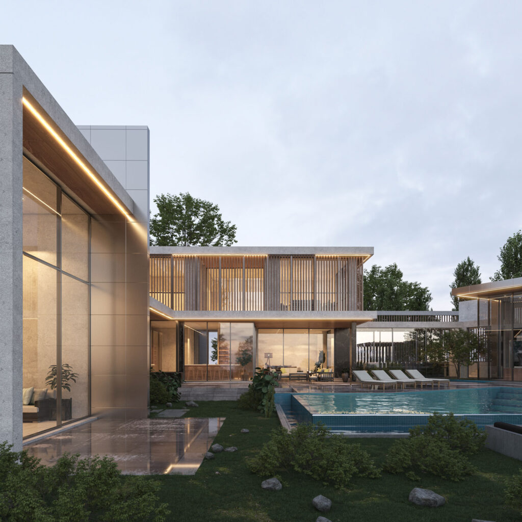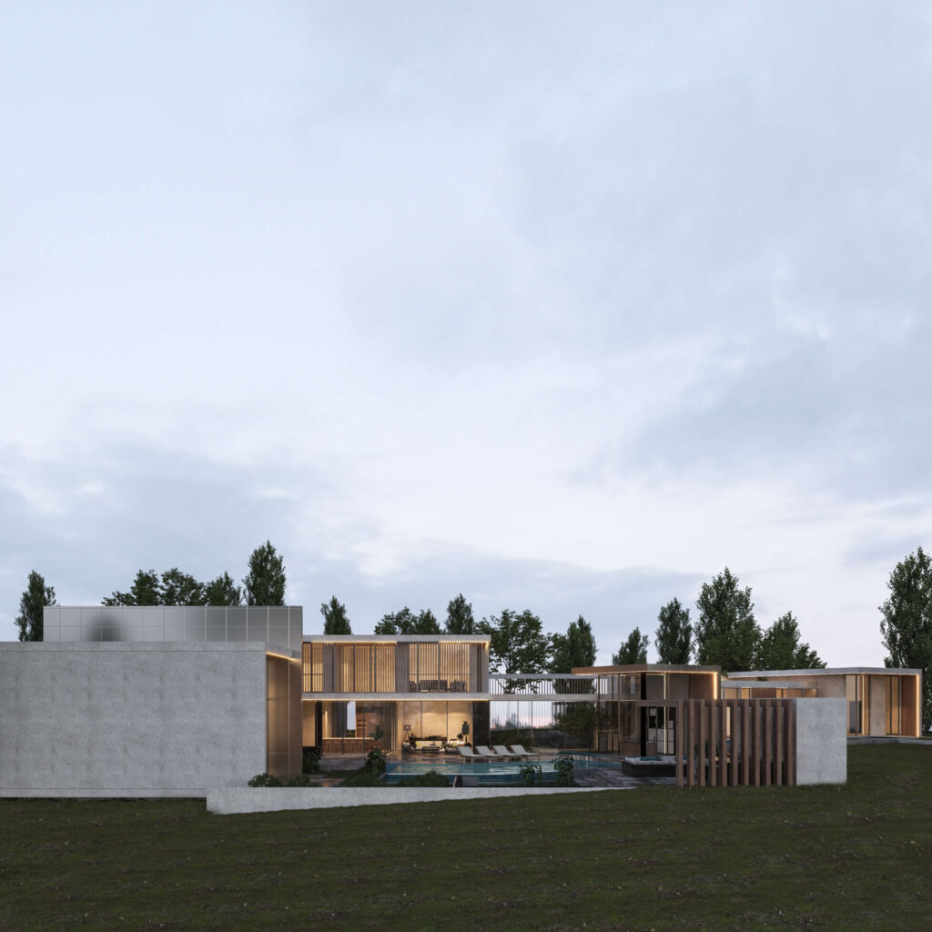 The buildings, characterized by their cubic forms and flat roofs, stand as individual expressions of elegance, yet together, they form a harmonious ensemble. The project’s layout is a strategic orchestration of private and shared domains, fostering both community and sanctuary.