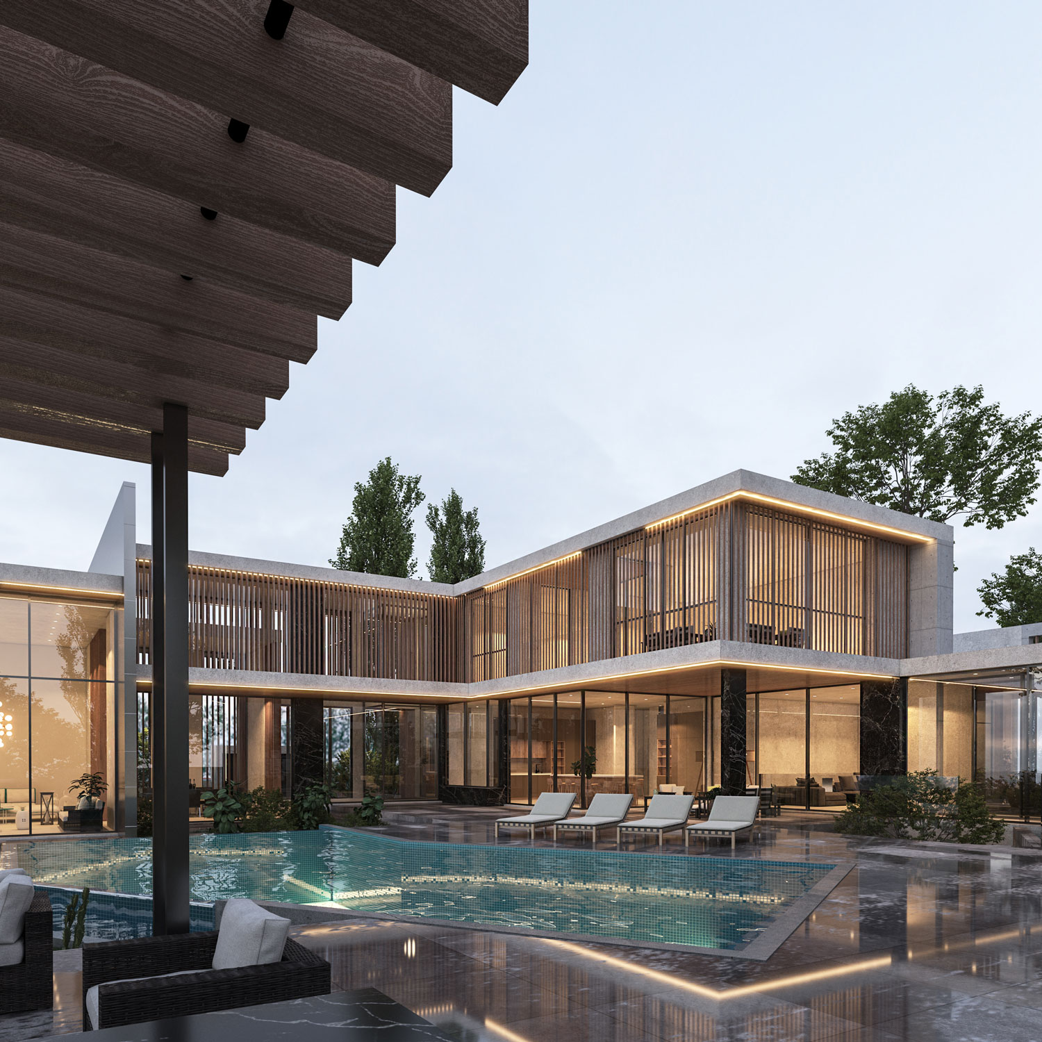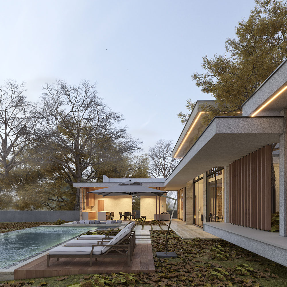 This architectural composition presents itself as an anthology of spaces, each chapter a celebration of clean lines and the art of minimalism, bound together by the fluid narrative of connectivity. It is an abode that honors the simplicity of modern design, with each structure sharing a language of materials and form.