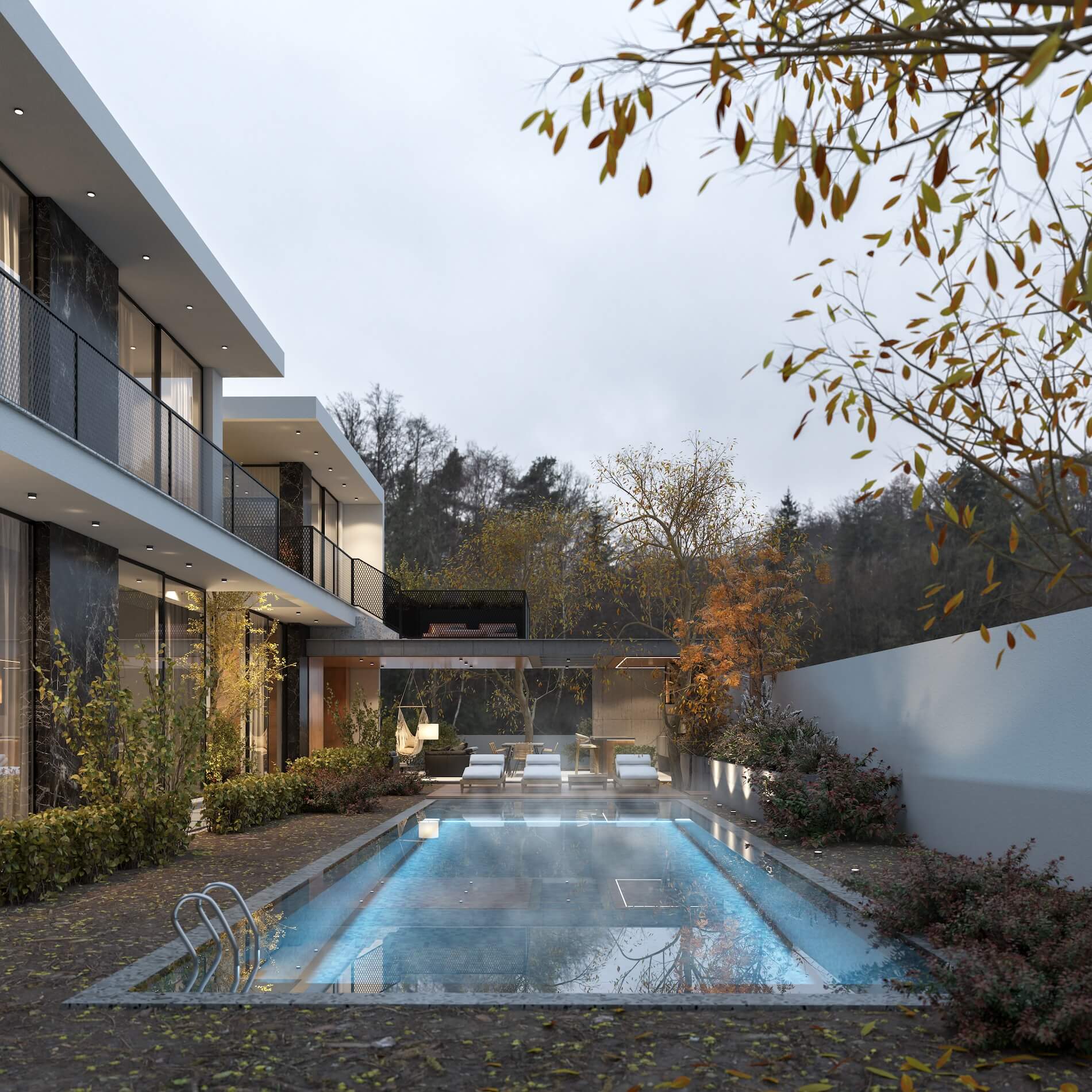 The structure is carefully placed to celebrate outdoor life, featuring a crystalline pool that anchors the garden. The adjacent lounging areas invite quiet moments and lively get-togethers, all in the spirit of relaxation and refined taste.