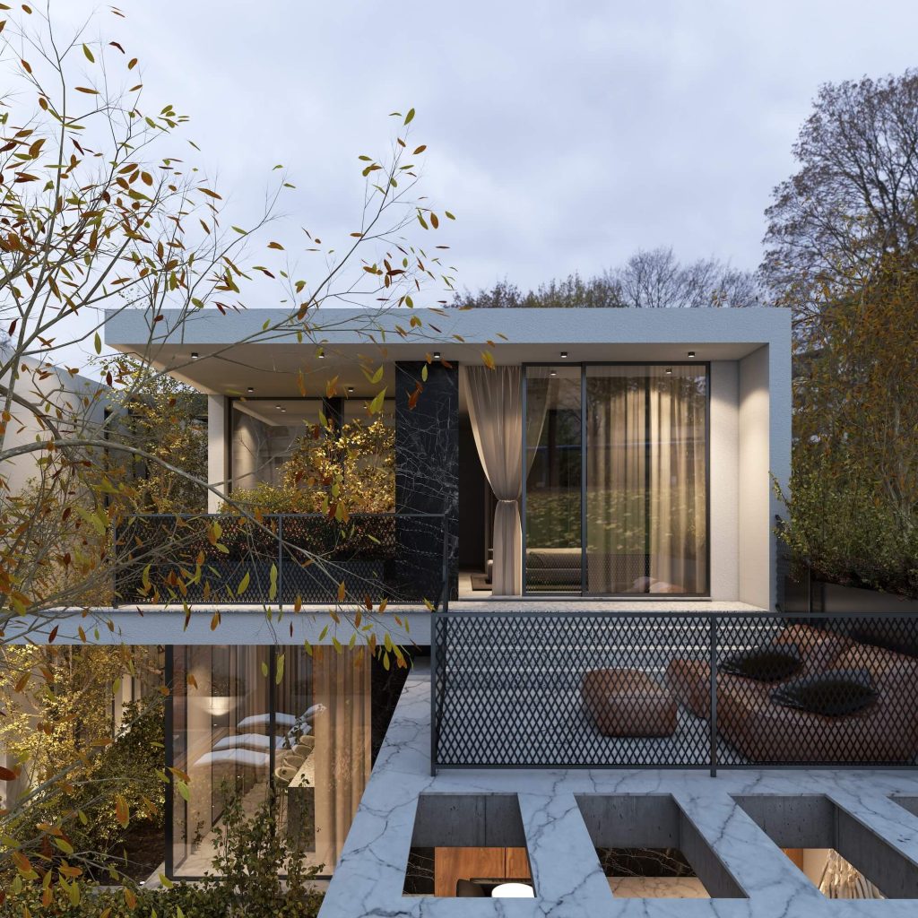 This house showcases a design that's both sleek and serene, with an array of straight, clean lines and vast windows that merge indoor comfort with the beauty of the outdoors. The upper section is graced by a wooden lattice that not only provides seclusion but also casts intriguing patterns of shadow, enhancing the home’s artistic appeal. Down below, the transparency of glass walls offers a seamless view into the verdant embrace of the garden, filling the living spaces with daylight.
