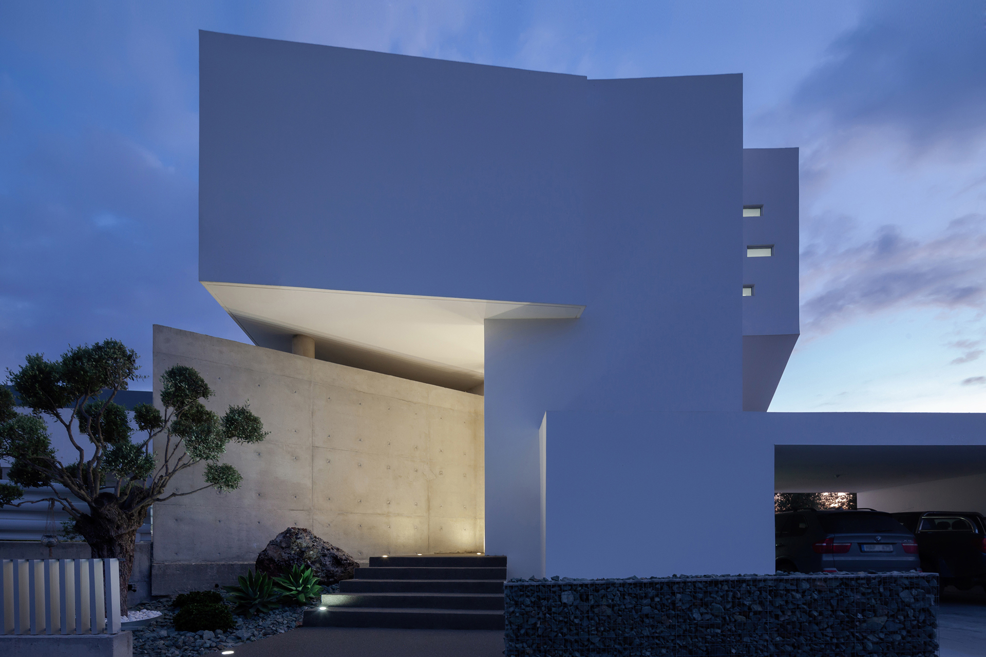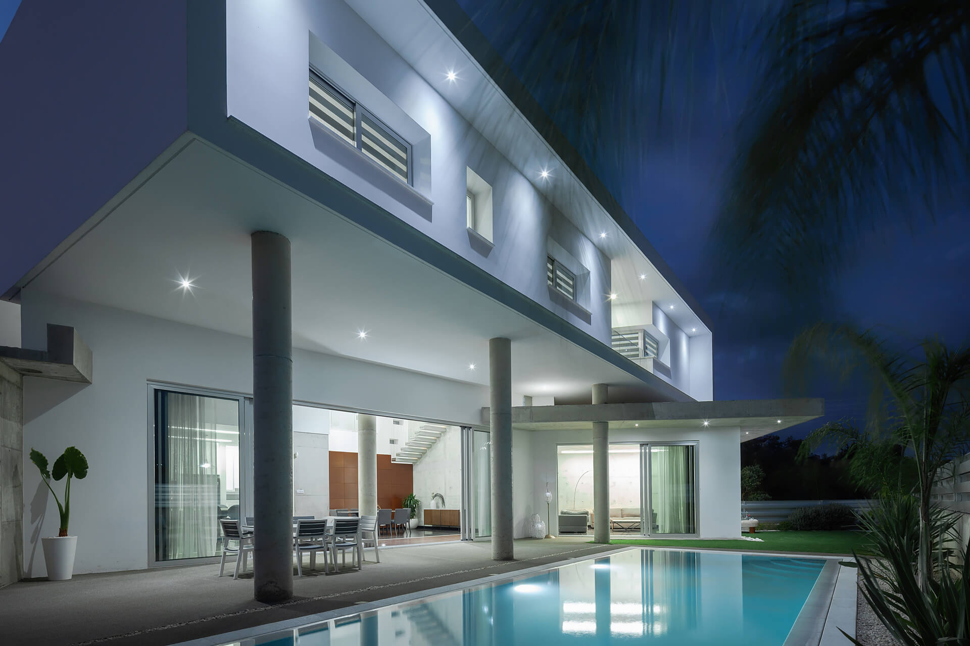 The house in Lympia was designed on three levels. On the ground floor are the common areas of the house. On the mezzanine floor overlooking all areas of the ground floor is the family room and on the first floor the bedrooms. All three levels are joined together physically and visually by vertical internal openings. The small windows on the west side of the house allow natural ventilation of all areas. The triangular movable glass roof created by the two main volumes of the house allows permanent ventilation for most months of the year. The large openings on the ground floor allow easy integration with the garden and the pool.