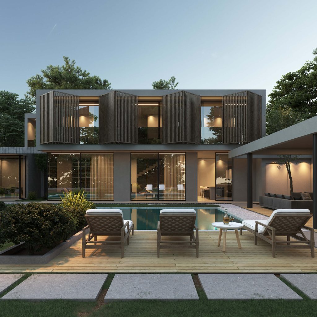 The design extends beyond the walls of the home, integrating functional outdoor spaces such as a swimming pool and cozy seating areas. These spaces are in tune with the house's minimalist style and offer additional areas for relaxation and entertainment.