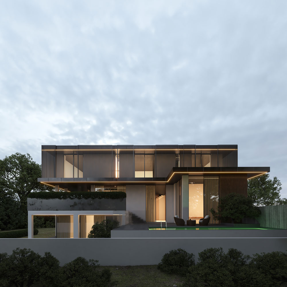The building's upper volume, sheathed in a vertical rhythm of metallic panels encapsulating the need for privacy and security within its stoic presence. Meanwhile, the wooden components on the lower levels soften the visual impact, their horizontal lines leading the eye and drawing one towards the entrance in a gesture of hospitality.