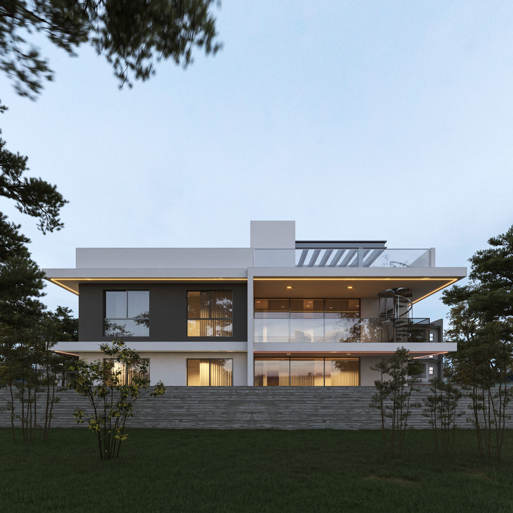 The structure’s façade is a dance of light and texture, with the soft glow from within spilling out to highlight the clean lines and meticulous craftsmanship. Here, in this gently lit tableau, the building's dual levels house living spaces designed not just for shelter but for the joy of dwelling in a space that is as much a home as it is a work of art.